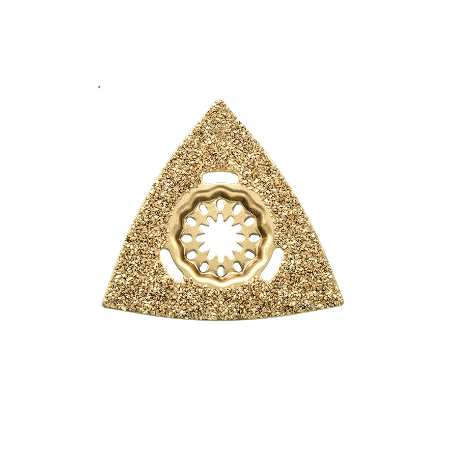 HM savklinge til afrensning af betonreester, mørtelfuger, gasbeton og fliser. Trekantet facon giver flere fleksible anvendelsesmuligheder.