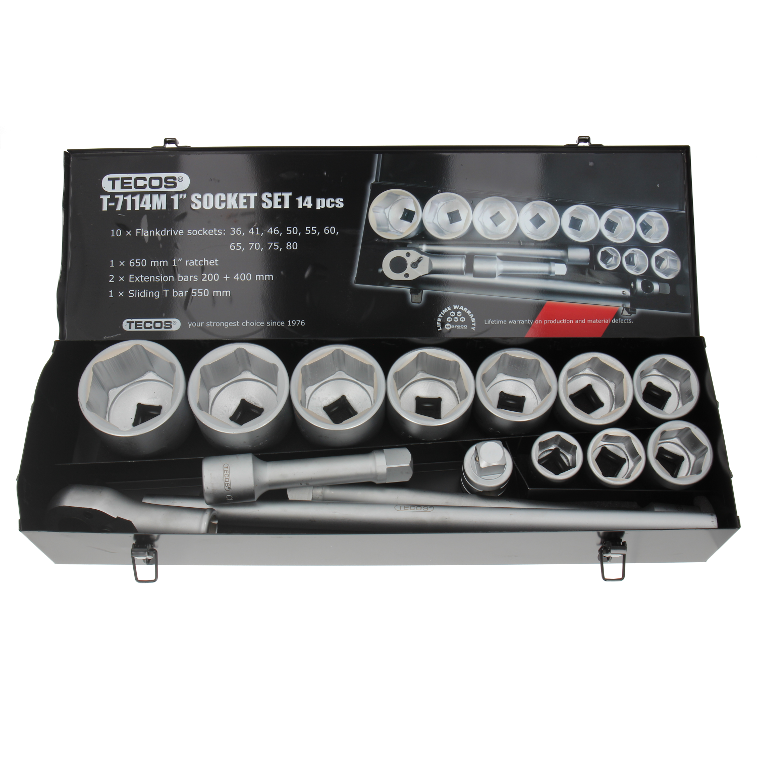 Topnøglesæt med dobbelt 6 kant toppe i store størrelser med skralde, forlænger og T-glidegreb.